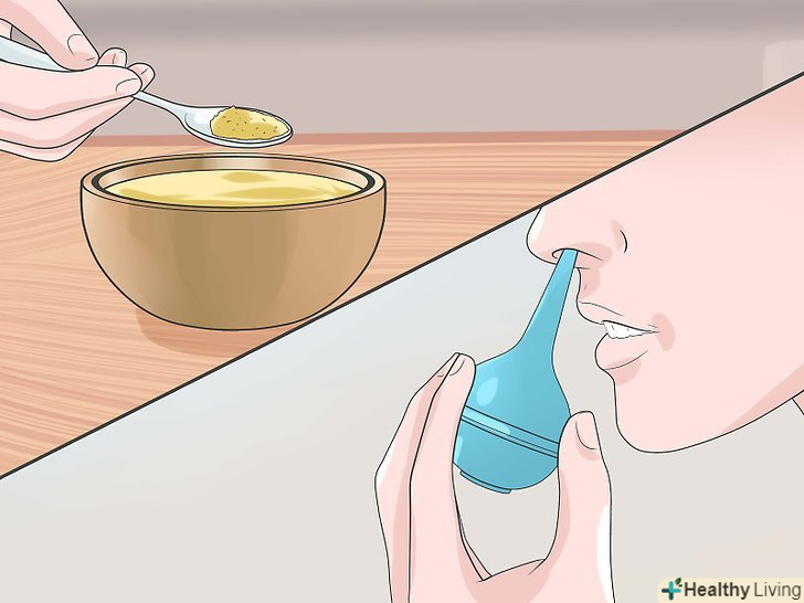 Промивайте ніс за допомогою іригатора. для промивання носа можна використовувати грушу, спринцівку або спеціальний посудину неті-пот. При цьому носова порожнина промивається стерильним соляним розчином. Таке промивання дозволяє видалити з носових проходів густу слиз і алергени, що викликають закладеність носа.[11]- Приготуйте власний соляний розчин, розчинивши чайну ложку солі в 450 мілілітрах води. Для зменшення печіння в носі можна додати ½ чайної ложки харчової соди.[12]