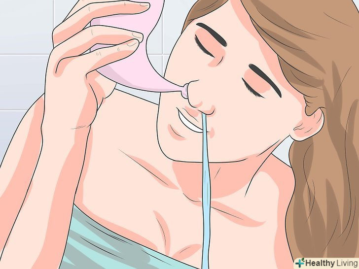 - Впорсніть соляний розчин в одну ніздрю так, щоб він пройшов через носову порожнину і витік з другої ніздрі. При цьому тримайте рот відкритим і не дихайте носом.[13]