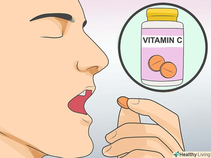 Приймайте вітамін C. Цинк і вітамін C більш ефективні, якщо їх приймати разом.[16] недавні дослідження показали, що сам по собі вітамін С має слабкий вплив на тривалість і серйозність застуди. Проте, при високих фізичних навантаженнях цей вітамін підвищує опірність простудних захворювань.[17]- Організм людини не здатний повністю засвоїти одноразову дозу вітаміну С, якщо вона перевищує 500 міліграмів. Протягом дня досить прийняти 1.000 міліграмів цього вітаміну.