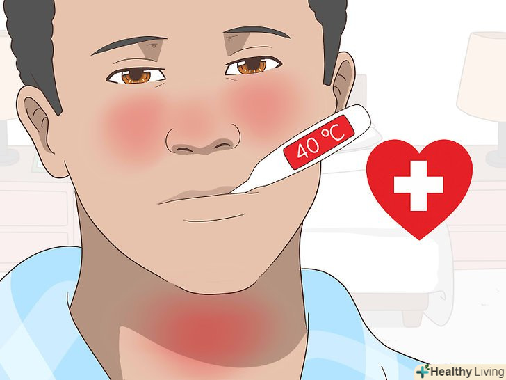 Зверніться до лікаря.якщо у вас сильно болить горло, а температура тіла не спадає нижче 38,3 °C протягом 24-48 годин (або навіть підвищується), радимо якомога швидше звернутися до лікаря.[15]- Крім того, якщо у вас запалилися лімфовузли з передньої або задньої сторони шиї і через це вам важко ковтати або дихати, якомога швидше зверніться за медичною допомогою (а якщо немає можливості відвідати лікаря в цей же день, зверніться до відділення невідкладної допомоги найближчої лікарні).[16]