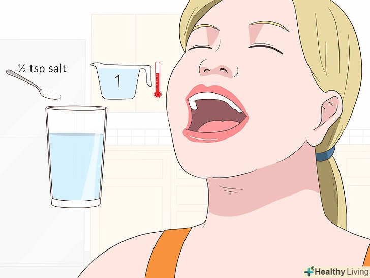 Полощіть горло солоною водою.незважаючи на відсутність наукових доказів, відомо, що полоскання солоною водою допомагають при болях в горлі.[3]- Насипте чверть або пів чайної ложки солі в чашку води кімнатної температури. Полощіть горло розчином хоча б 30 секунд кілька разів на день.