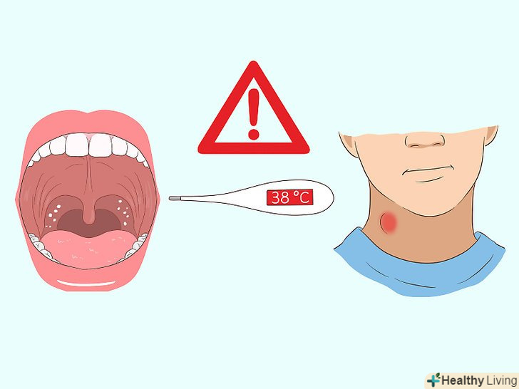 Розпізнайте симптоми і ознаки більш серйозної інфекції горла.хоча вірусні інфекції горла зустрічаються набагато частіше (і проходять самі по собі через кілька днів), при наявності симптомів, які вказують на щось більш серйозне на зразок ангіни дуже важливо, щоб вас оглянув лікар.[12] Обов'язково зверніться до лікаря, щоб перевірити, чи не захворіли ви ангіною, якщо у вас спостерігаються два або більше з наступних симптомів:[13]- Підвищена температура (зокрема, температура вище 38ºC);