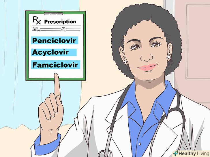 Застосовуйте антивірусні препарати.такі антивірусні препарати як Пенцикловір, ацикловір і фамцикловір схвалені для лікування спалахів герпесу. Ці препарати не виліковують від герпесу і не застосовуються для запобігання його спалахів, але вони можуть прискорити процес загоєння і полегшити перебіг спалаху вірусу.[3] зазвичай найбільший ефект застосування цих препаратів досягається, коли ви починаєте їх застосовувати при перших симптомах наближення спалаху герпесу.- Якщо у вас часто трапляються спалахи герпесу, то ваш лікар може прописати ці препарати для щоденного прийому, навіть при відсутності симптомів, щоб припинити спалахи в подальшому. Такий метод лікування може бути ефективним для деяких людей, але клінічні випробування не показали переконливих результатів.