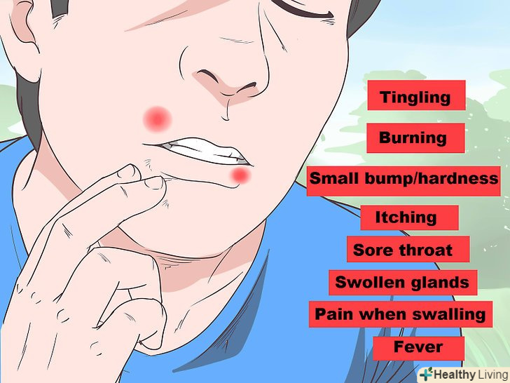 - Серед інших ранніх симптомів можуть бути такі, як свербіж на губах або на шкірі навколо рота, біль в горлі, набрякання залоз, больові відчуття при ковтанні і підвищена температура.[1]