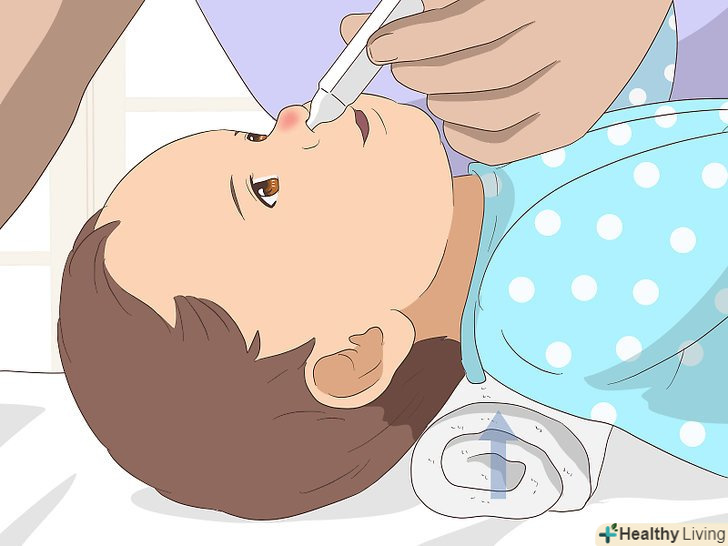 Використовуйте сольовий розчин, щоб розріджувати слиз.покладіть дитину на рівну поверхню і помістіть під плечі згорнутий рушник, щоб голова відкинулася назад. Капніть кілька крапель розчину в кожну ніздрю. Сольовий розчин розріджує слиз, що допомагає позбутися від неї і полегшити дихання.[13]- Щоб приготувати власний сольовий розчин, розведіть 1/4 чайної ложки (1,4 грама) нейодованої солі в 1/2 склянки (120 мілілітрах) злегка теплої фільтрованої або дистильованої води.