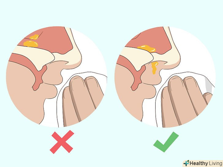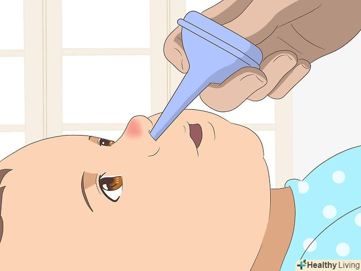 Видаліть слиз, щоб дитині було легше дихати.якщо дитина досить доросла, попросіть його обережно висякатися. Якщо дитина занадто малий, видаліть зайву слиз з кожної ніздрі за допомогою гумової спринцівки. Спочатку видавіть з спринцівки повітря, а потім обережно вставте її кінчик в ніздрю. Відпустіть грушу, щоб спринцівка всмоктала слиз, після чого дістаньте її з ніздрі і видавіть слиз на серветку або паперовий рушник. Виконайте те ж саме з другою ніздрею.- Поверніть з хустки невеликий конус і прочистіть їм ніздрі.не вставляйте в ніс дитини ватяні палички.