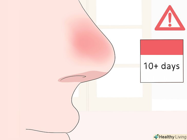 Відвідайте лікаря, якщо закладеність носа триває довше 10 днів.закладеність носа повинна пройти протягом тижня, і якщо вона триває довше 10 днів, то у вас може бути інфекція. Лікар зможе виключити інші можливі причини, наприклад грип, і при необхідності призначити відповідне лікування.[21] інфекція може супроводжуватися наступними симптомами: [22]- Температура вище 38,5 °C;