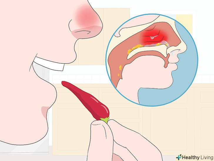 Поїжте що-небудь гостре, щоб тимчасово полегшити закладеність носа.якщо у вас закладені пазухи носа, подумайте про те, щоб з'їсти що-небудь більш гостре, ніж те, до чого ви звикли. Гостра їжа подразнює слизову оболонку і тим самим сприяє виведенню слизу з носа. Можливо, за допомогою цього легкого способу вам вдасться тимчасово прочистити ніс.[7]- Запивайте їжу достатньою кількістю води, а після прийому їжі обережно висякатися.