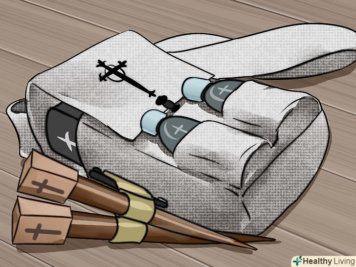 Майте при собі інші знаряддя для полювання на вампірів. якщо ви зображуєте мисливця на вампірів або вбивцю вампірів, ви можете носити з собою інші предмети, які не вб'ють вампіра, але можуть його затримати. До них відносяться: [14]- Священні предмети, наприклад, хрест або Біблія. Вампіри-злі істоти, тому зазвичай вони відкидають священні предмети. Це не обов'язково повинні бути виключно християнські об'єкти, тому символи іудаїзму, ісламу та інших релігій теж підійдуть.