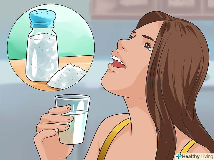 Полощіть горло солоною водою.полоскання горла теплою солоною водою дозволяють зволожити слизову, що сприяє заспокоєнню кашлю.[27] засіб для полоскання горла можна швидко приготувати в домашніх умовах.[28][29]- Додайте ¼ - ½ столової ложки солі в склянку теплої дистильованої або кип'яченої води.