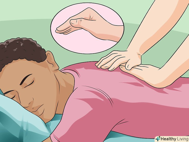 Позбавтеся від закладеності в грудях за допомогою постукувань.якщо ви знаходитесь вдома, і у вас є помічник, вдайтеся до техніки постукування, щоб полегшити закладеність дихальних шляхів. Цей прийом найкраще використовувати вранці і ввечері безпосередньо перед сном.[13]- Сядьте так, щоб ви могли спертися спиною на спинку стільця або стіну. Попросіть помічника скласти долоню човником, трохи зігнувши пальці. Потім помічник повинен почати твердо і швидко постукувати вас по грудним м'язам. Тривалість процедури-5 хвилин. далі необхідно лягти на живіт, підклавши під стегна подушку. Зігніть руки в ліктях і розташуйте їх з боків. Знову попросіть помічника швидко і твердо постукати вас по спині (в області лопаток і вище) складеної човником долонею. Залишайтеся в даній позі 5 хвилин.