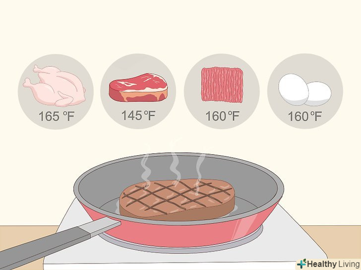 Піддавайте ретельній термічній обробці м'ясо і яйця.коронавіруси можуть передаватися від тварин людям, тому дуже важливо прожарювати і проварювати продукти тваринного походження, щоб знищити можливу інфекцію.[18] дотримуйтесь інструкції з приготування, рекомендовані для виду м'яса або яєць, які ви готуєте, і перевіряйте готовність за допомогою кухонного термометра, перш ніж вживати страву в їжу.[19] Рекомендована температура для деяких видів продуктів становить: