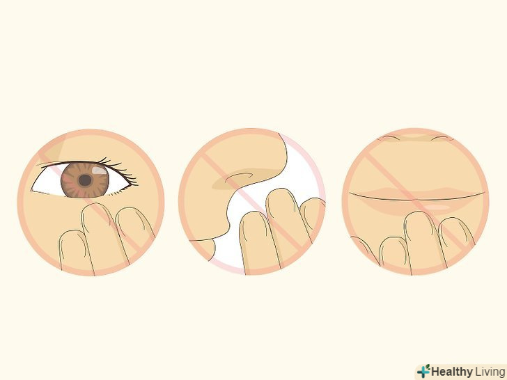 Намагайтеся не доторкатися руками до очей, носа і рота.коронавірус може потрапити на шкіру рук, коли ви торкаєтеся до предметів, наприклад беретеся за дверну ручку або торкаєтеся до стільниці. Якщо ви торкнетеся немитими руками особи, мікроби, що потрапили на ваші руки, потраплять в організм. Щоб уникнути цієї небезпеки, намагайтеся не доторкатися руками до носа, очей і рота.[5]- Якщо вам потрібно доторкнутися до особи, спочатку гарненько вимийте руки-це допоможе знизити ризик зараження вірусом.