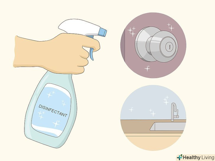 Проводьте щоденну дезінфекцію поверхонь, до яких торкається багато людей.на жаль, коронавірус може зберігатися якийсь час на різних поверхнях, в тому числі на дверних ручках, стільницях і кранах. Використовуйте дезінфікуючий спрей або дезінфікуючі серветки з хлором для щоденної обробки таких поверхонь. Зверніть увагу, що оброблена поверхня повинна залишатися вологою не менше 10 хвилин — це необхідно для ефективного знищення вірусів. Регулярна обробка дезінфікуючими засобами допоможе знизити ризик контактної передачі вірусу і поширення інфекції.[9]- У себе вдома обробляйте дезінфікуючим засобом ручку вхідних дверей, кухонні стільниці, поверхні у ванній і туалеті, а також крани.