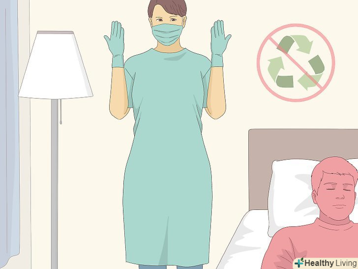 Використовуйте засоби індивідуального захисту, коли доглядаєте за хворим.якщо ви доглядаєте за хворою людиною, перш ніж увійти до нього в кімнату, надіньте одноразові рукавички, медичну маску і одноразовий медичний халат.[13] коли ви закінчите процедури і вийдете з кімнати, зніміть Засоби захисту і викиньте в пластиковий сміттєвий пакет. Не використовуйте засоби захисту повторно-цим ви піддасте себе небезпеці зараження вірусом.[14]- Коронавірус передається повітряно-крапельним шляхом і може зберігатися якийсь час на одязі, тому зробіть все можливе, щоб захистити себе від зараження вірусом.