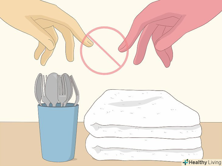 Не користуйтеся предметами домашнього вжитку спільно з хворою людиною.коронавірус може зберігатися на предметах домашнього вжитку, наприклад на чашках, тарілках, столових приладах і рушниках. Якщо хтось в будинку захворів, постарайтеся захистити інших членів сім'ї від інфекції: виділіть кожній людині окремі побутові речі.[15]- Краще перестрахуватися! Якщо вам здається, що на предмет могли потрапити віруси, проявіть обережність: ретельно вимийте предмет перед використанням або візьміть інший.