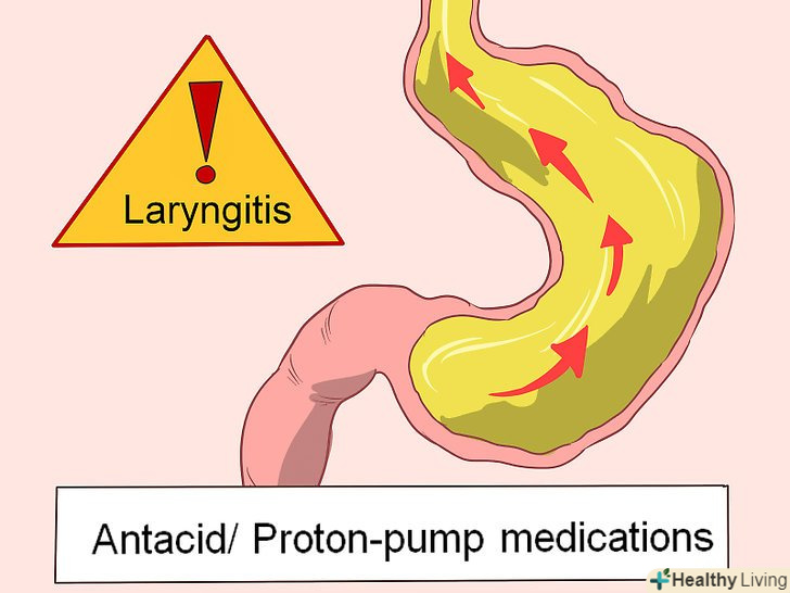 Вилікуйте причину ларингіту.як зазначалося вище, ларингіт може бути викликаний різними захворюваннями горла і оточуючих його органів. Наприклад, його часто викликає гастроезофагеальна рефлюксна хвороба (ГЕРХ), при якій шлунковий сік піднімається в стравохід, що призводить до подразнення і запалення горла і гортані.[13] таким чином, лікування ГЕРХ за допомогою антацидних засобів і інгібіторів протонного насоса в кінцевому підсумку допоможе також усунути ларингіт. Це відноситься і до інших захворювань, які викликають ларингіт, таким як збільшення щитовидної залози, алергія, хронічний синусит, бронхіт, доброякісні утворення на голосових зв'язках і рак горла.- Хронічний ларингіт (хрипота) від тривалого куріння може зникнути сам по собі після відмови від цієї шкідливої звички, хоча може пройти багато місяців або навіть кілька років, перш ніж голосові зв'язки знову стануть здоровими.