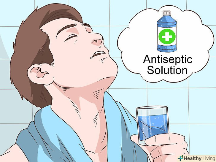 Прополощіть горло розчином антисептика.ларингіт може бути викликаний інфекцією горла. Найбільш поширені вірусні інфекції, хоча хрипоту може викликати і бактеріальна або грибкова (кандидоз) інфекція.[6] якщо ви підозрюєте, що ларингіт пов'язаний з інфекцією, полощіть горло антисептичними розчинами, щоб знищити мікробів. Розчиніть ½ чайної ложки (3,5 грама) солі в склянці (240 мілілітрах) теплої води — це ефективний засіб від бактерій і деяких інших мікробів. Полощіть їм горло хоча б по одній хвилині раз на годину, поки не позбудетеся від роздратування (запалення) горла і не відновите нормальний голос.- Якщо ларингіт викликаний інфекцією, він може супроводжуватися також такими симптомами, як трохи підвищена температура, нездужання (втома) і опухлі лімфатичні вузли або залози на шиї або навколо неї.[7]