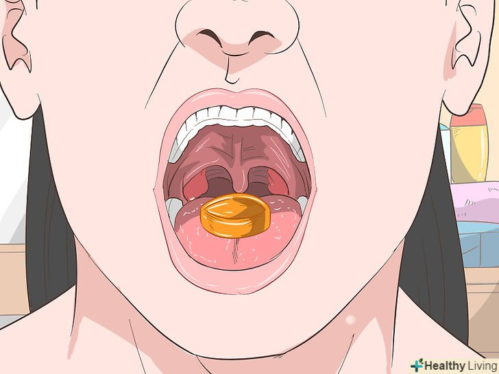Спробуйте смоктати льодяники.крім вживання великої кількості води, використовуйте лікувальні льодяники-це також допоможе зволожити слизову оболонку горла і стимулювати виділення слини. Крім того, продаються в аптеках лікувальні льодяники зазвичай містять інгредієнти, які притупляють біль в горлі і тим самим полегшують проковтування рідин і їжі. Не смокчіть звичайні цукерки, так як міститься в них цукор (або його замінники) підвищує виділення слизу в горлі, і в результаті вам доведеться частіше прочищати його.- Виберіть льодяники з цинком, медом, евкаліптом і/або лимоном — ці інгредієнти допоможуть заспокоїти слизову оболонку горла. Крім того, цинк є м'яким антисептиком.