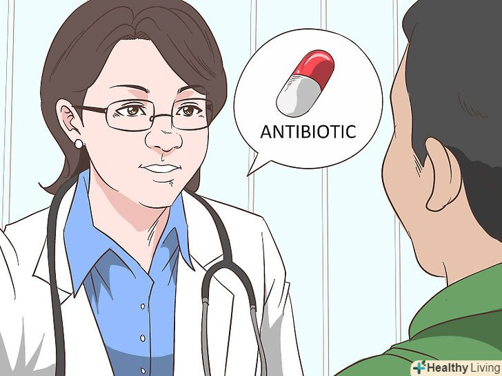 Порадьтеся з лікарем щодо антибіотиків.якщо ви не можете позбутися від ларингіту за допомогою перерахованих вище домашніх засобів, запишіться на прийом до лікаря. Сильний біль в горлі, опухла слизова оболонка з прожилками білого гною, жар і нездужання свідчать про інфекцію. Однак врахуйте, що антибіотики лікують лише бактеріальні інфекції, тому лікар, швидше за все, візьме мазок горла, щоб з'ясувати, чи є інфекція бактеріальної, вірусної або грибкової.- Якщо причиною є бактерії (досить часто ларингіт буває пов'язаний зі стрептококовою інфекцією), лікар може призначити двотижневий курс лікування антибіотиками, наприклад амоксициліном або еритроміцином. Неухильно дотримуйтесь приписів лікаря і не припиняйте приймати антибіотики завчасно навіть в тому випадку, якщо відчуєте себе краще. Це необхідно для того, щоб повністю позбутися від бактерій, які можуть залишитися після неповного курсу лікування. Інакше бактерії можуть придбати стійкість до антибіотиків, і в подальшому вам буде дуже складно впоратися з хворобою.