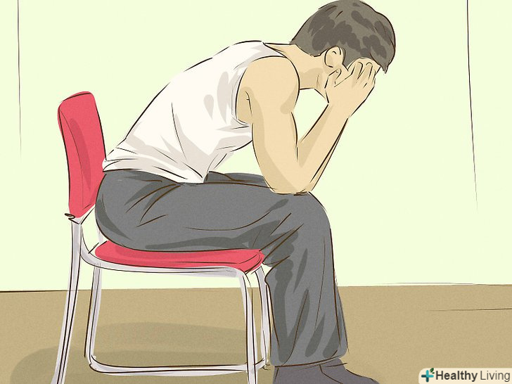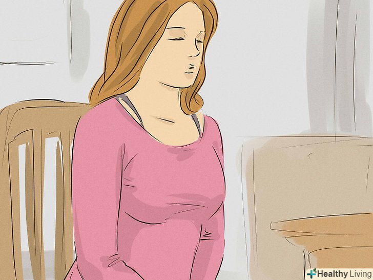 Сядьте і нахиліться вперед.Сядьте на стілець і твердо упріться ногами в підлогу. Розслабте м'язи і нахиліться трохи вперед, витягнувши груди над колінами. Покладіть лікті на коліна, щоб можна було уперти руки в підборіддя. Дозвольте напрузі вийти з вашого тіла.- Можна також покласти руки на стіл, опустивши на них голову.[23]