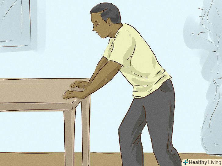 Нахиліться вперед і покладіть руки на меблі.Встаньте біля стійкого предмета меблів, наприклад біля великого столу або шафи. Розслабте м'язи і поставте ноги на ширині плечей. Нахиліться вперед, поклавши руки або лікті на меблі. Покладіть голову на руки, розслабляючи м'язи шиї.[25]