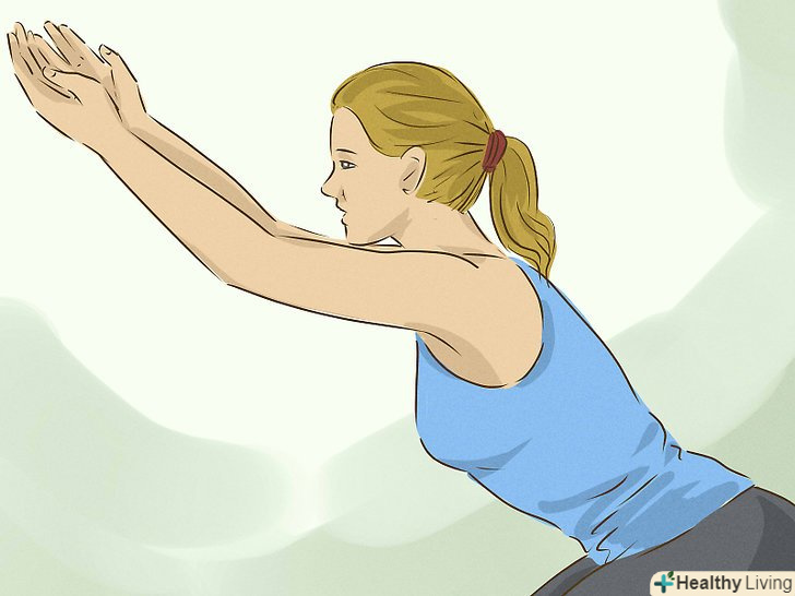 Розтягуйте стінки грудної клітини.вдихайте носом, піднімаючи руки над головою. Роблячи вдих, рахуйте до чотирьох. Поверніть кисті долонями назовні, це допоможе краще розтягнути стінки грудної клітини. Випустіть повітря через стиснуті губи, опускаючи руки.- Відпочиньте кілька секунд, потім повторіть чотири рази.[26]