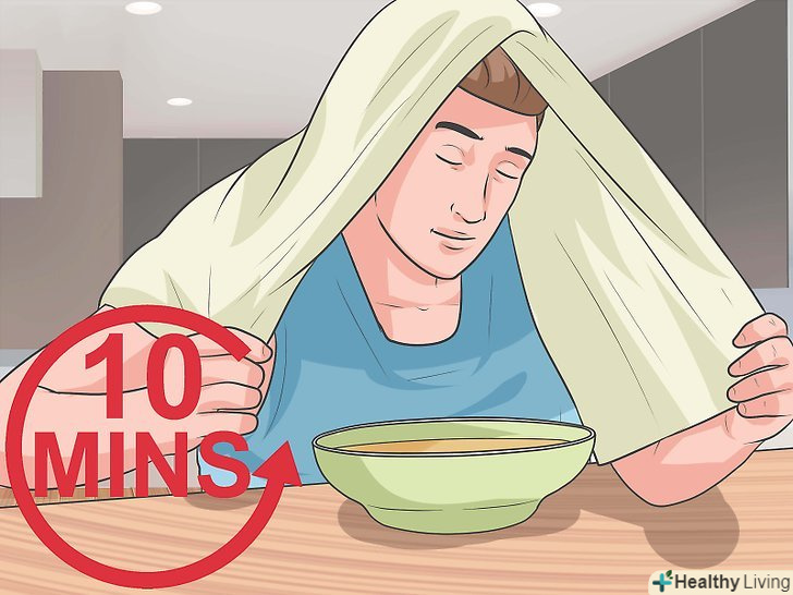 Подихайте паром.нахиліться над каструлею з гарячим рослинним розчином і накиньте на потилицю великий чистий рушник. Тримайте обличчя не менше ніж в 30 сантиметрах від води, щоб не обпектися, і закрийте очі. Вдихайте пар носом і видихайте ротом на рахунок 5. Подихайте парою 10 хвилин або до тих пір, поки він не зникне. Відкашлюйтеся під час процедури, а після неї гарненько висякатися.- Повторно розігрівайте воду, поки від неї не піде густий пар, і повторюйте процедуру кожні дві години або так часто, як зможете.