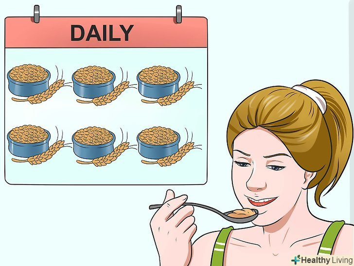 Щодня з'їдайте 6-8 порцій зернових продуктів.краще вживати продукти з цільних зерен, а не перероблений білий рис або перероблену білу муку, оскільки в них міститься більше харчових волокон і поживних речовин. Одна порція являє собою скибочку хліба або півсклянки вареного рису або макаронів. Можна збільшити споживання продуктів із цільних зерен наступним чином:[4]- Купуйте борошно і макарони з цільної, а не білої пшениці. Як правило, на упаковці подібних продуктів зазначено, що вони зроблені з цільної пшениці.