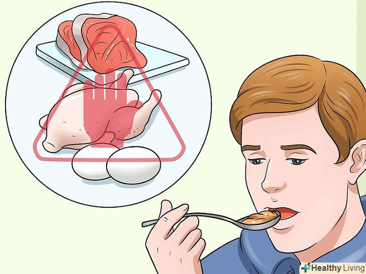 У помірних кількостях їжте нежирне м'ясо, птицю і рибу.м'ясо і риба є прекрасним джерелом білків, вітамінів, заліза і цинку, проте в деяких сортах міститься велика кількість жиру і холестерину. Жир і холестерин закупорюють артерії, тому краще обмежити їх споживання. З'їдайте не більше 6 порцій в день. Одна порція становить 30 грамів м'яса або яєць.[7]- Утримуйтеся від жирного червоного м'яса, і якщо ви все ж вживаєте його, намагайтеся обрізати жир. Не смажте м'ясо на сковороді — корисніше запікати його або смажити на грилі.