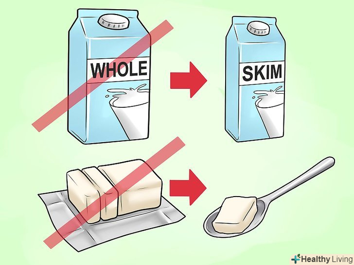 Контролюйте споживання жирів.жир підвищує ризик розвитку серцевих захворювань. Щоб зберегти здоров'я серця, обмежте споживання жирів максимум трьома порціями в день. Одна порція еквівалентна столовій ложці (15 мілілітрів) вершкового масла. Можна досить просто обмежити споживання жирної їжі наступними способами:[8]- Не намастіть хліб вершковим маслом або майонезом. Можна також зменшити кількість рослинного масла, яке ви використовуєте при приготуванні їжі. Використовуйте не незбиране, а знежирене молоко, і уникайте жирних вершків, сала, твердих різновидів жиру для тіста, пальмового і кокосового масла.