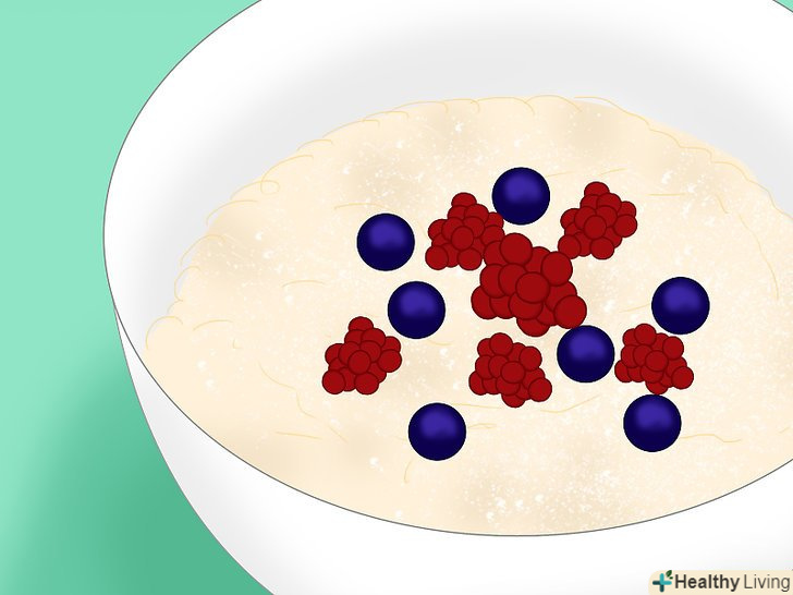 Зміцніть своє здоров'я за допомогою продуктів з цільних злаків.у них міститься більше поживних речовин і харчових волокон, ніж в білому борошні, і ними легше насититися. Постарайтеся отримувати основну кількість калорій з цільних злаків іншої їжі, що містить складні вуглеводи. З'їдайте шість-вісім порцій в день. Одна порція може складатися, наприклад, з половини склянки вареного рису або шматка хліба. Підвищіть споживання цільного зерна наступними способами:[3]- Їжте на сніданок вівсяну кашу або пластівці грубого помелу. Щоб підсолодити кашу, додавайте в неї свіжі фрукти або родзинки.