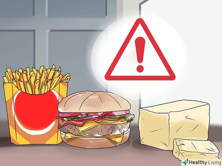 Утримуйтеся від насичених і транс-жирів.при дотриманні здорової дієти, спрямованої на запобігання атеросклерозу, одним з основних принципів є відмова від насичених і транс-жирів. Насичені жири містяться в продуктах тваринного походження, таких як вершкове масло і сало; транс-жири часто зустрічаються в гідрованому рослинному маслі, що входить до складу маргарину і багатьох напівфабрикатів. Жири цих двох видів підвищують вміст холестерину більш, ніж будь-які інші фактори. Якщо ви дотримуєтеся дієти для здорового серця, необхідно, щоб на частку цих жирів доводилося не більше 5% від загальної щоденної кількості калорій. Наприклад, якщо ви споживаєте 2.000 калорій в день, кількість насичених і транс-жирів не повинно перевищувати 13 грамів.[3]- Пам'ятайте про те, що не всі жири шкідливі. Оливкова і арахісове масло, горіхи, різні насіння і авокадо дуже корисні для серцево-судинної системи.