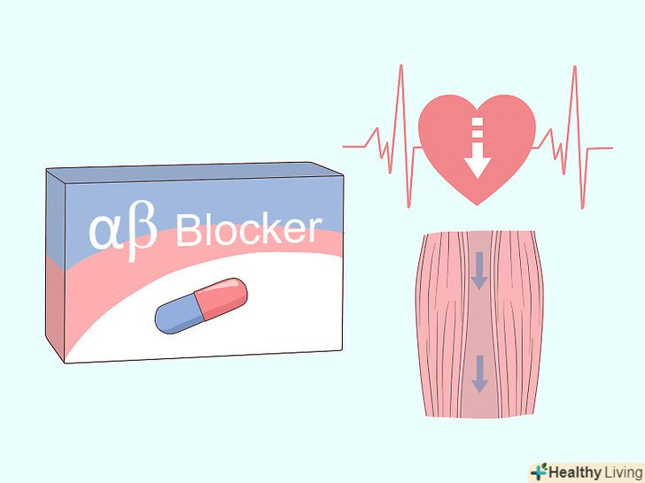 Приймайте Комбіновані альфа-бета-блокатори.такі препарати знижують артеріальний тиск швидше, ніж більшість інших ліків, і є першою лінією оборони для пацієнтів, які страждають від підвищеного кров'яного тиску.[30]- Ці препарати знижують опір в артеріях, що знижує і частоту серцевого ритму.