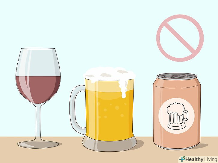 Обмежте вживання алкоголю.у невеликій кількості алкоголь може викликати зниження кров'яного тиску. У великих же кількостях спиртне, навпаки, здатне привести до підвищення кров'яного тиску.[6]- Чоловікам і жінкам у віці старше 65 років дозволяється випити один келих вина або іншого напою з аналогічним вмістом алкоголю в день. Для дорослих у віці до 65 років, відповідно, допускається вживання до двох келихів в день.
