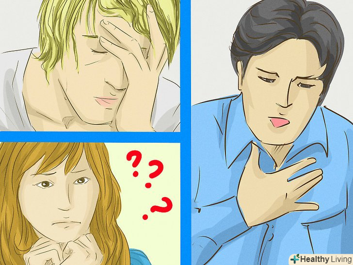 Розпізнайте панічну атаку. почуття сильної тривоги може викликати напади паніки. Спочатку симптоми панічної атаки можуть нагадувати ознаки інфаркту. Ви можете відчувати часте серцебиття, рясне потовиділення, слабкість або переднепритомний стан, біль в грудній клітці, утруднене дихання. [34]- Симптоми панічної атаки розвиваються дуже швидко і зазвичай так само швидко проходять. Якщо ваш стан не покращився протягом 10 хвилин, зверніться за медичною допомогою. [35]
