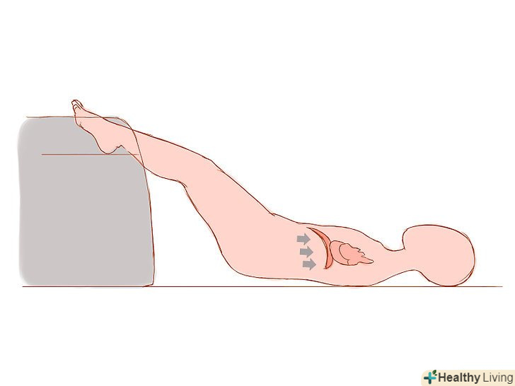 Ляжте.ляжте на спину, і підніміть ноги вгору. Це дозволить діафрагмі розкритися, і полегшить ваш стан, Ви зможете дихати, і таким чином наситити кров киснем. [4]- Ви можете підкласти під ноги подушки або якийсь інший предмет. Крім того, можна лягти на підлогу, ноги піднявши на диван або на крісло.