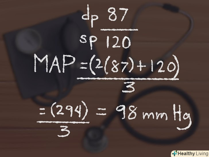 Виміряйте свій артеріальний тиск.для того щоб розрахувати середній артеріальний тиск, необхідно знати систолічний і діастолічний тиск. Якщо ви ще не знаєте, який тиск у вас є, виміряйте його. Існує безліч різноманітних (і часом химерних) способів визначити кров'яний тиск, але все, що вам знадобиться для отримання більш-менш достовірного результату вимірювання — це тонометр і фонендоскоп. Як нагадування: систолічний тиск-це значення на манометрі, при якому ви чуєте через фонендоскоп перший удар, а діастолічний — це значення, при якому ви перестаєте вловлювати серцебиття.[2]- Якщо ви не знаєте, як виміряти артеріальний тиск, то нижче ви знайдете покрокову інструкцію (абозверніться до нашої статті на дану тему).