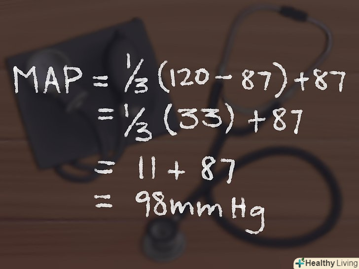 - Наприклад, якщо ви виміряли артеріальний тиск і показник вашого діастолічного тиску становить 87, а систолічного - 120 мм рт. ст., то, вставивши показники в наше рівняння, ми отримаємо середній артеріальний тиск, рівний (2(87) + 120)/3 = (294)/3 =98 мм рт. ст.