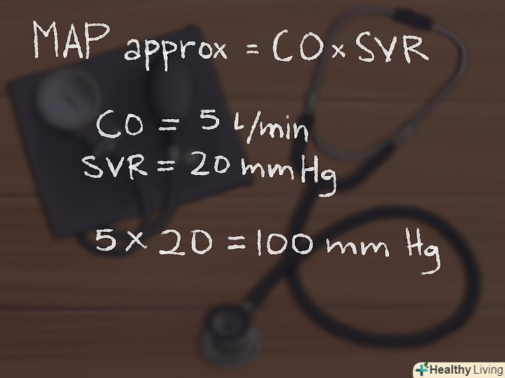 Якщо вам не потрібні точні значення, скористайтеся наступною формулою: СВ? ОПСС. У певних ситуаціях це рівняння, в якому використовується серцевий викид (СВ, вимірюється в л/хв) і загальний периферичний судинний опір (ОПСС, вимірюється в мм рт. ст.), застосовується для швидкої приблизної оцінки середнього артеріального тиску пацієнта. Хоча результати цього рівняння не мають 100% точності, вони зазвичай застосовні для приблизної оцінки. Зауважте, що СВ і ОПСС зазвичай вимірюються в умовах стаціонару при наявності спеціального обладнання (хоча є досить прості методи і для їх визначення).- У жінок нормальний серцевий викид зазвичай дорівнює ~ 5 л / хв. якщо ми припустимо, що ОПСС жінки дорівнює 20 мм рт. ст. (що лежить ближче до верхньої межі норми), то її середній артеріальний тиск буде відповідати 5х20 = 100 мм рт. ст