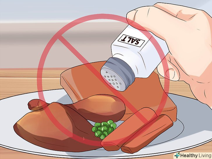 - Зменшити вживання солі можна за допомогою скорочення вживання солоної переробленої їжі і консервів з додаванням солі. Намагайтеся не солити свою їжу: не соліть м'ясо, коли його готуєте, і не соліть воду, коли варите рис або макарони.