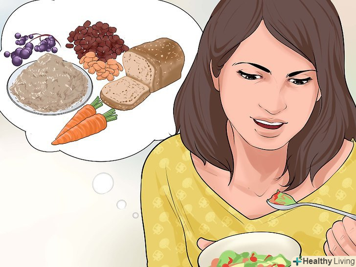 Вживайте більшеХарчових волокон.це тісно пов'язане з попереднім заходом, оскільки складні вуглеводи зазвичай є хорошим джерелом харчових волокон. Крім продуктів з цільних зерен, їжте боби, фрукти, овочі та насіння, в яких міститься багато харчових волокон.[10] постарайтеся замінити солодкі закуски гарбузовим насінням, малиною або яблуками — все це є відмінним джерелом харчових волокон.[11][12]- Постарайтеся щодня вживати 25-30 грамів харчових волокон. Наприклад, більшість жителів США вживають лише 10-12 грамів харчових волокон в день.[13]