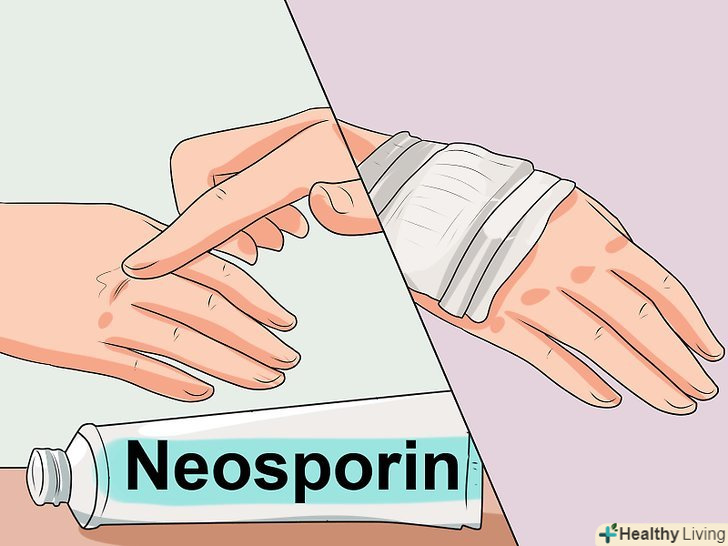 Запобігайте занесенню інфекції.щоб запобігти занесенню інфекції, після того, як ви охолодите місце опіку, нанесіть мазь з антибіотиком, наприклад, неоспорин або бацитрацин. Зробити це ви можете чистим пальцем або ватним тампоном. Далі накрийте область опіку стерильною пов'язкою, яка не прилипне до обпаленої ділянки. Міняйте пов'язку один-два рази на день і після того, як ви наносите мазь.- Не проколюйте пухир.
