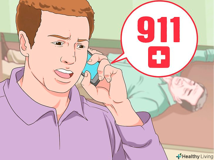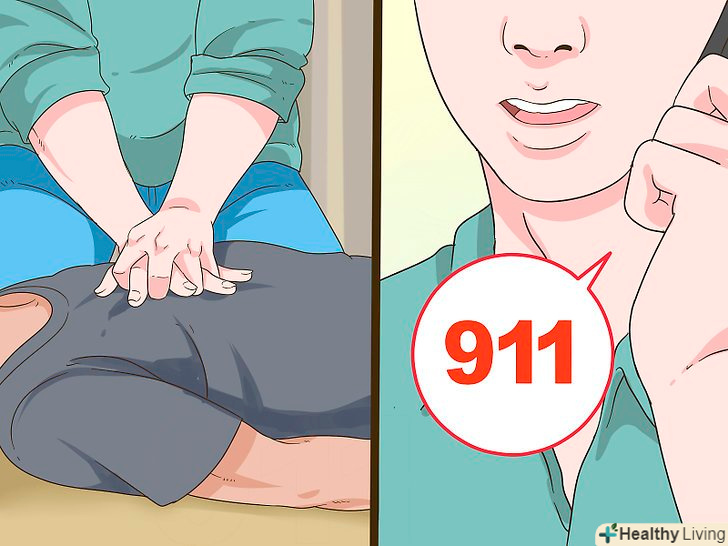 Переконайтеся, що потерпілий дихає і що у нього є пульс.проковтування великої кількості (або висококонцентрованого) пероксиду водню може викликати ускладнене дихання. Якщо потерпілий втратить свідомість і у нього будуть спостерігатися прискорене дихання, слабкий пульс, або пульсу, також як і дихання, не буде зовсім, вам (або тому, хто вміє проводити реанімацію) потрібно буде провести реанімацію і негайно викликати швидку.[13]- Навіть якщо потерпілий може дихати і йому не потрібно штучне дихання, швидка допомога все одно може дати дихальну маску тому, хто проковтнув пероксид водню, особливо якщо вона високої концентрації.