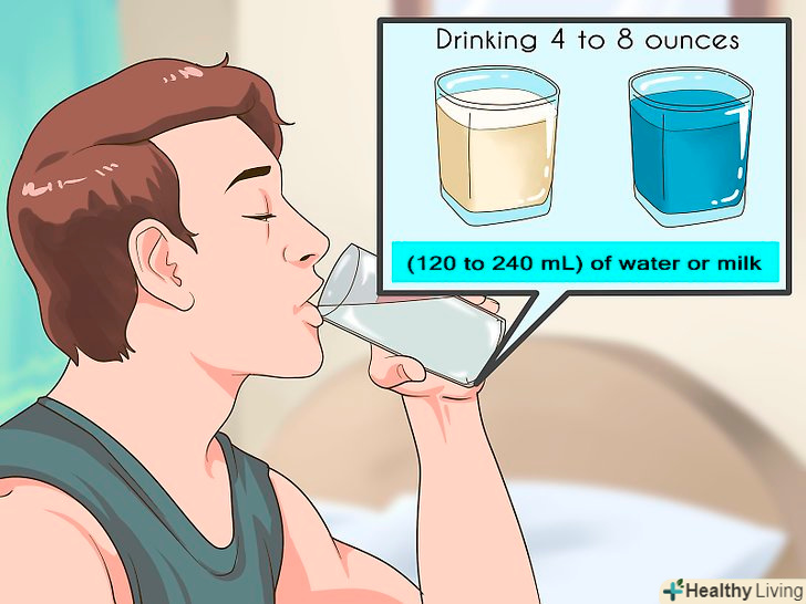 Випийте склянку води або молока. 120-240 мл води або молока можуть допомогти при поглинанні невеликої кількості побутової перекису. У разі поглинання великої кількості розчину або розчину високої концентрації вам все одно варто випити води або молока; не забудьте при цьому якомога швидше викликати швидку.[15]- Якщо розчин потрапив лише в ротову порожнину, спробуйте прополоскати рот прохолодною водою.