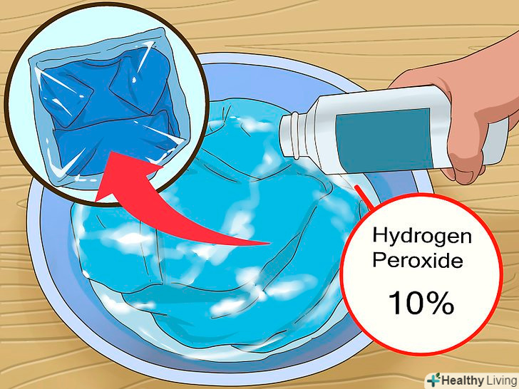 Зніміть одяг, яка промокла пероксидом водню.якомога швидше зніміть з ділянок опіку або роздратування забруднену пероксидом одяг, особливо якщо на вас потрапив висококонцентрований розчин. Зніміть весь одяг, прикраси та інші предмети, на які пролився і які ввібрали в себе розчин. Помістіть їх у поліетиленові пакети, якщо концентрація пероксиду водню становить 10 і більше відсотків.[2]