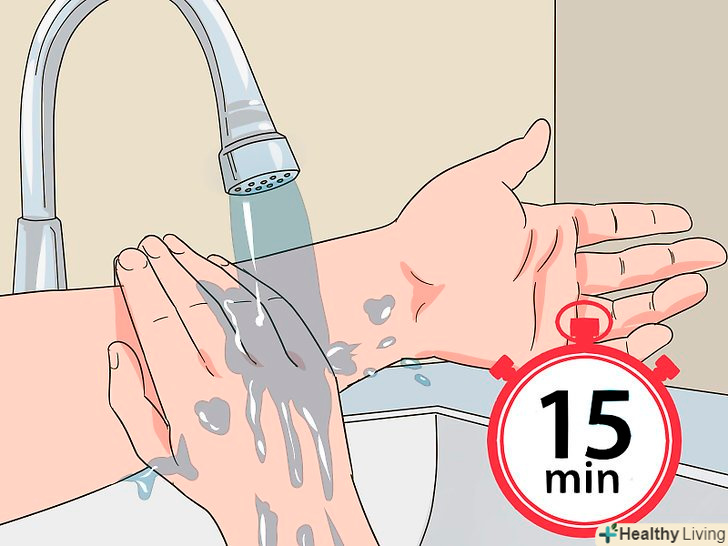Промивайте ділянку прохолодною водою протягом 15 хвилин.утримуйте уражену ділянку під прохолодною проточною водою, щоб змити розчин і вгамувати біль. Промивання під раковиною допоможе обробити невеликі ділянки шкіри, на які потрапив побутовий розчин перекису. Прийміть прохолодний душ, щоб промити великі ділянки ураженої шкіри або ділянки, на які потрапив висококонцентрований розчин.[3]