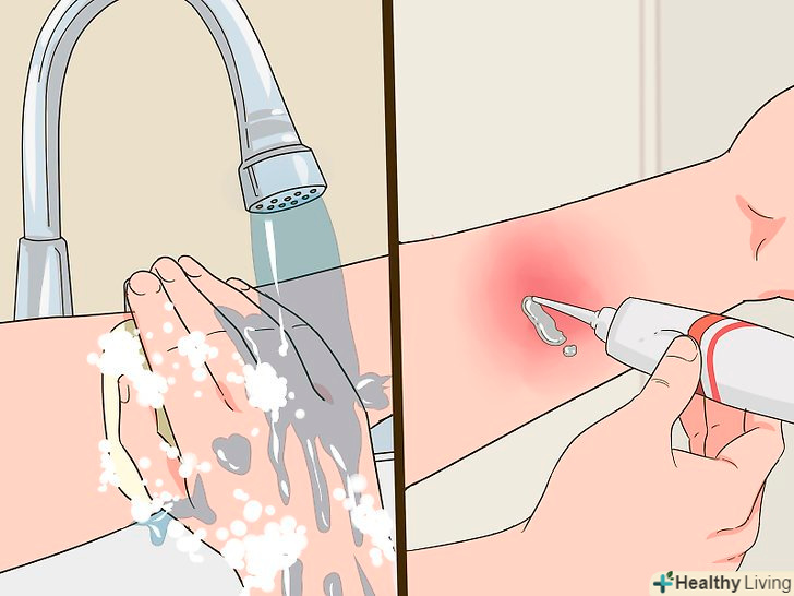 Обережно промийте уражені місця і нанесіть на них мазь або гель.хімічні опіки від попадання пероксиду водню лікуються тим же чином, що і звичайний термічний опік.[4] продовжуйте промивати ділянку прохолодною водою, поки біль не вщухне. Помийте місце опіку м'яким милом, а потім нанесіть на нього антибактеріальну мазь.[5]- Не тріть шкіру і не проколюйте з'явилися пухирі.