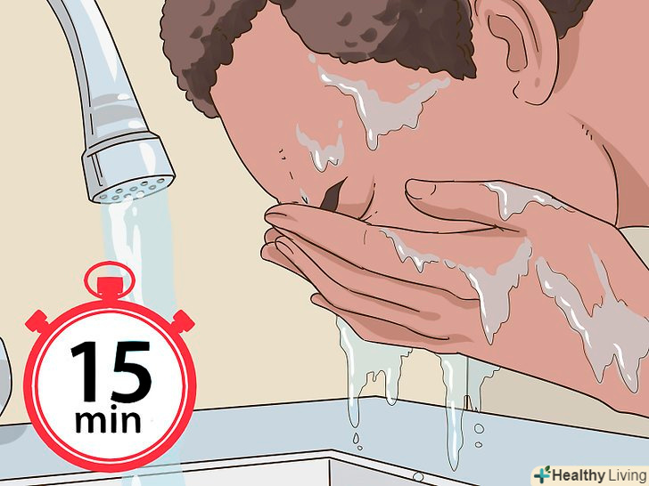 Промивайте очі прохолодною водою протягом не менше 15 хвилин.ретельно вимийте руки, щоб на них не залишалося пероксиду водню. Підставте їх під проточну прохолодну воду і продовжуйте промивати очі протягом 15-20 хвилин. Якщо вам не вдається промити очі під краном в раковині, прийміть прохолодний душ.[8]- Спробуйте промити очі 0,9% сольовим розчином. Якщо у вас під рукою є пляшечка з сольовим розчином, погляньте на етикетку, щоб дізнатися його концентрацію.[9]