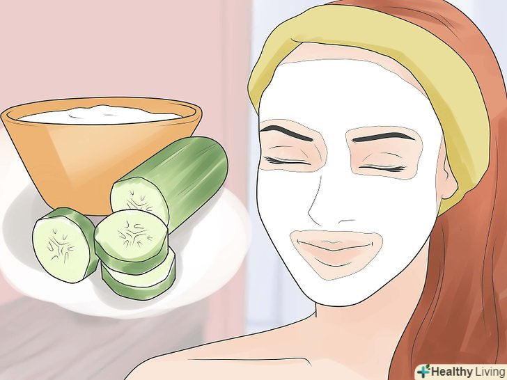 - Приготуйте огіркову маску. Почистіть огірок і зробіть з нього пюре. Потім нанесіть трохи пюре на обличчя як маску. Огіркова паста допоможе розсіяти тепло в шкірі.[24]